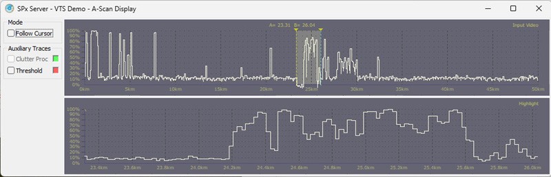 In the image shown in Figure 1, we see the radar intensity as a function of range. The top trace shows the radar signal from zero range on the left side to 50km on the right side. The intensity of the signal varies according to the reflected radar energy, which arises from targets, clutter or noise. The lower trace below shows a zoomed view of the highlighted region in the top trace. This type of radar display image is called A-Scope. The data samples that are derived from this data is the radar video.