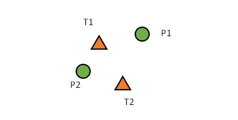 Consider two tracks and two measurements as shown in Figure 1. The tracks, T1, and T2 are close enough together so are considered as a cluster for the purposes of association. New measurements are taken in the area around T1 and T2 and these are P1 and P2. We have two tracks and two measurements. The association problem is to decide which track should be associated with, and then updated by, which measurement. For example, is P1 a measurement of T1 or of T2? We have two possibilities: