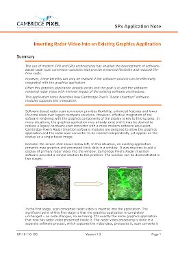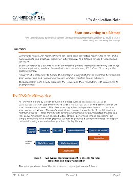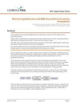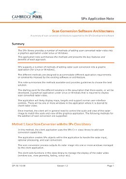 The SPx library scan conversion module provides an Application Programming Interface (API) to control the processing and presentation of the radar video. A small number of calls from the application software to the module are used to set-up and dynamically configure the operation. Changes to window size, scale or display presentation are effected in real-time, to help ensure that the radar component of the display stays synchronised to changes in the other graphics layers. Updates to the contents of the scan-converted bitmaps can be reported to the application software at a programmable rate through one of a number of software event mechanisms, or else the scan-converter can directly update the screen itself to semi-transparently blend the radar video with the graphics. Either way, SPx supports real-time sector-based updates of the radar display or else lower frequency (quadrant or scans) as needed.